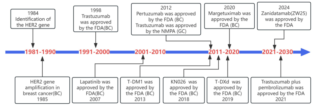 在过去的三十年中,在胃癌和乳腺癌等实体瘤领域,HER2已成为新型药物的关键靶点,包括TKI、ADCs和双特异性抗体药物(图2)。