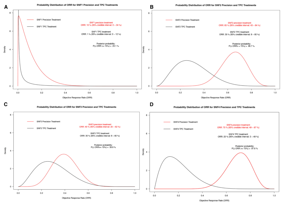 研究结果显示,SNF1亚型ORR低于20%的概率达到85.7%,提前终止,最终预测该亚型中依维莫司联合内分泌治疗组和医生选择的化疗(TPC)组的ORR为10%vs 0%。SNF3亚型氟唑帕利联合TPC和TPC组的ORR为40%vs 30%,未达到预设界值。