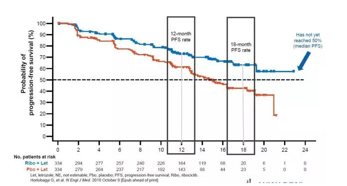 图2. MONALEESA-2研究中期分析PFS的Kaplan-Meier曲线分析