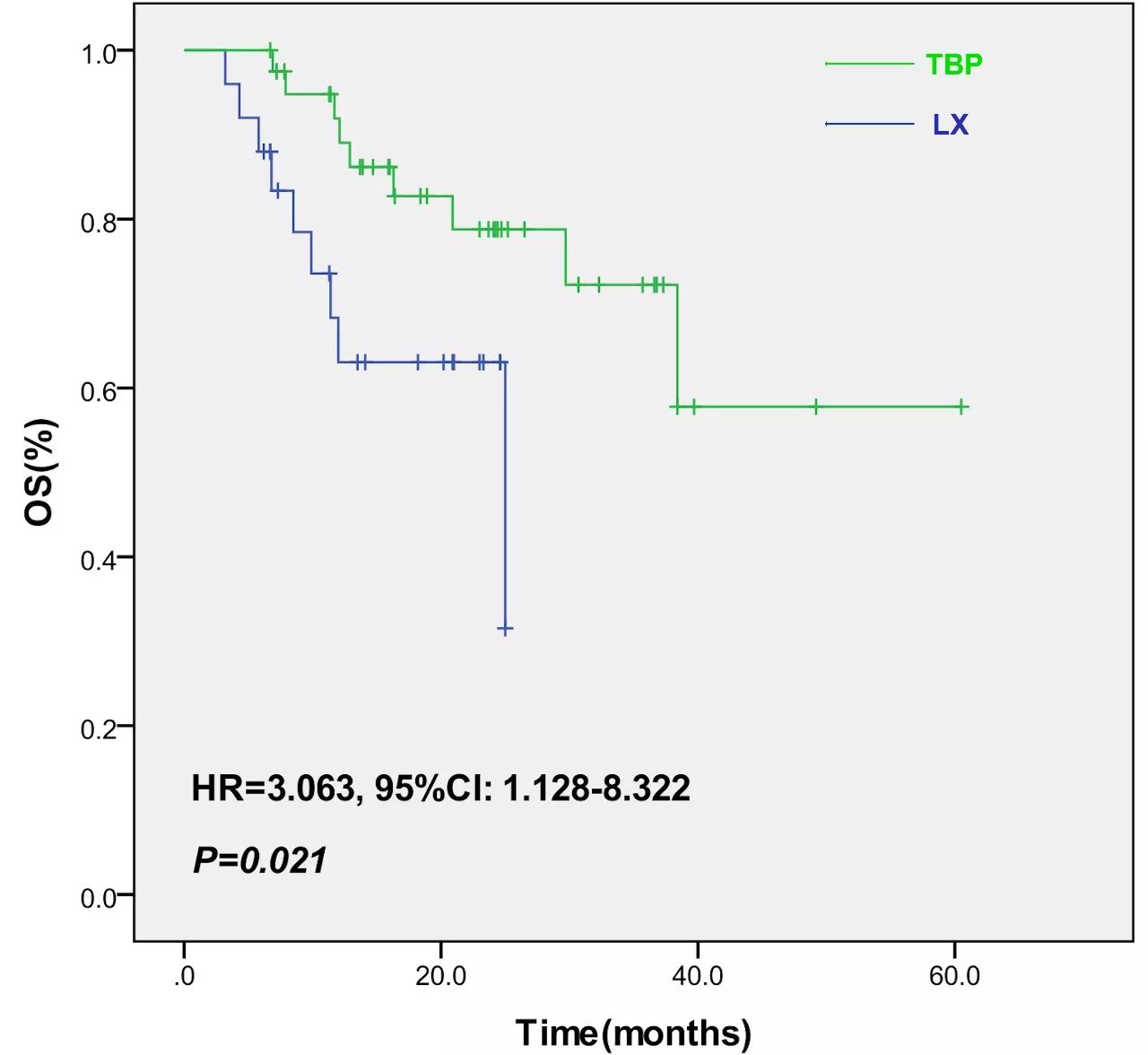 原发性耐药LX组和TBP组的中位PFS分别为8.0个月和5.3个月(P=0.038)