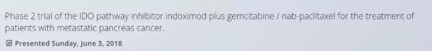 编者按:PD-1/PD-L1等相关的免疫治疗在各类肿瘤中效果斐然,却折戟胰腺癌。今年ASCO年会上有一项评估IDO通路抑制剂Indoximod联合吉西他滨/ nab-paclitaxel治疗转移性胰腺癌的II期试验(摘要4015)初步显示阳性结果。下面,我们来听听复旦大学附属肿瘤医院虞先濬教授的精彩点评!