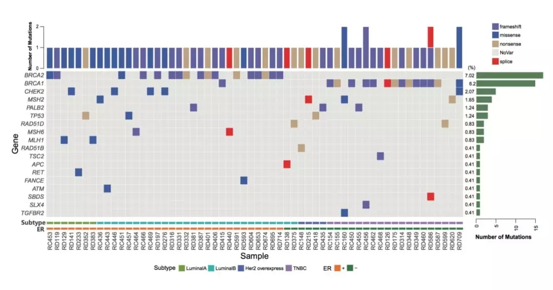 中国医学科学院肿瘤医院从2000年至2015年期间就诊的乳腺癌患者中,纳入242名年轻女性(发病年龄≤35岁)患者进行研究。通过采集患者的临床病理资料和收集外周血样品,使用139-gene panel对胚系突变进行检测,筛选出有害的胚系突变。