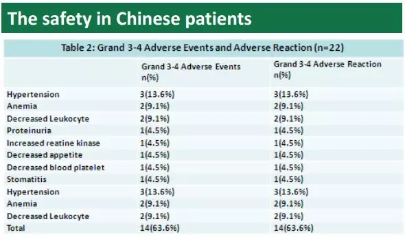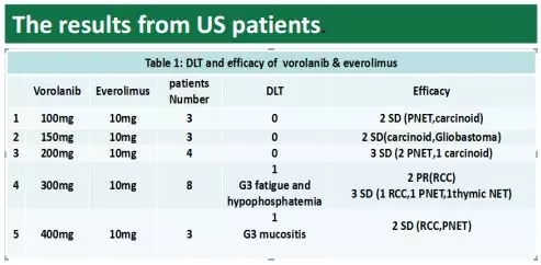 2017年度ASCO大会报告了北大肿瘤医院开展的Vorolanib(CM082)与依维莫司联合用于晚期肾癌的Ⅰ期临床研究。研究纳入至少接受过一线靶向治疗的晚期肾癌患者,采用传统的3+3剂量递增原则,具体给药方法:CMO82分别进行100mg Qd,150mg Qd,200mg Qd三个剂量水平递增,依维莫司剂量固定为5mg Qd,研究自2015年9月至2016年7月共入组22例患者,基本上既往均接受过一二线治疗。结果显示Vorolanib200mg推荐剂量水平14例患者中,获得客观有效率为35.7%(5/14),中位无进展生存时间为7.4个月。