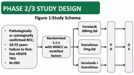 基于上述结果,2017年初由郭军教授牵头国内三十余家泌尿肿瘤中心研究中心,启动了Vorolanib联合依维莫司与单药Vorolanib、以及单药依维莫司用于晚期肾癌二线治疗的随机对双盲双模拟平行对照的Ⅲ期临床研究,研究简称为CONCEPT研究,主要入组标准为既往接受过一线抗血管靶向药物的晚期肾癌患者,根据MSKCC评分随机接受Vorolanib联合依维莫司与单药Vorolanib、以及单药依维莫司治疗,计划入组390例,截至2018年5月,全国已经入组50%受试者。