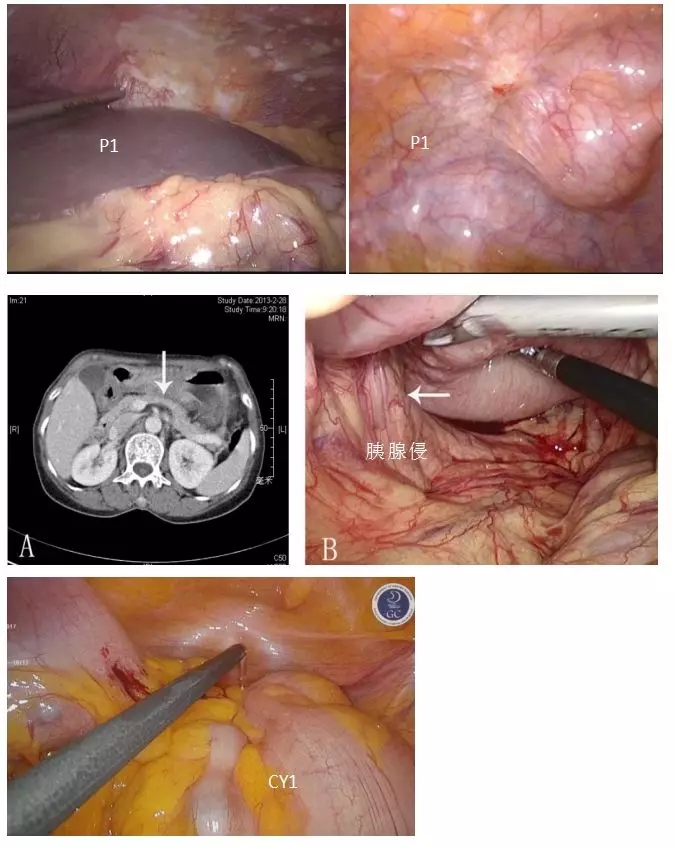 通过腹腔镜分期可以判断是否存在腹膜转移,补充其它分期方法的不足,提供精确的临床分期(cTNM),还可以判断肿瘤切除可能性(T4b,结合影像学)。根据探查结果分为三类,P0,CY0;P0,CY1;P1(图5)。