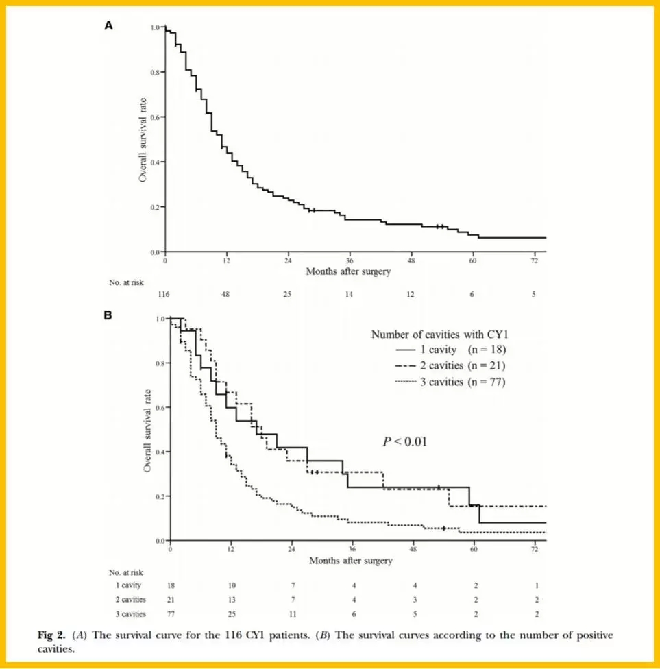 Kano Y等报道的一项研究显示,116例CY(+)患者总体2年生存率为22.9%,中位生存时间为11个月。1、2、3腔隙细胞学阳性者2年总生存率分别为41.9%、35.8%、15%,中位生存时间分别为17、18、9个月(P<0.01)(图7)[7]。