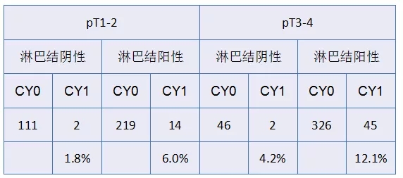 分析了复旦肿瘤医院2011~2018年期间行手术切除者765例病理分期与CY阳性率关系,发现腹腔脱落细胞阳性率为8%(P0CY1),淋巴结转移患者CY阳性率更高(表1)。
