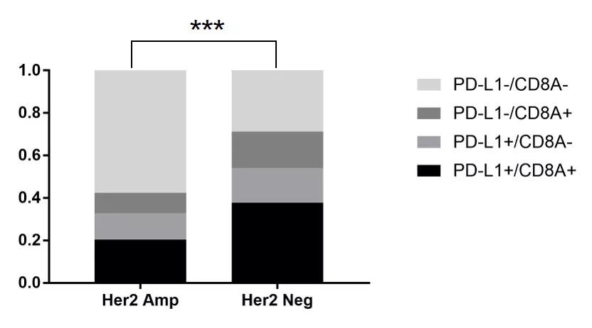 2.3 HER2基因扩增对PD-L1/CD8阳性比例分布的相关性