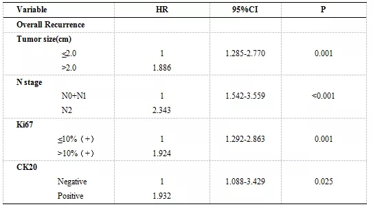 本研究的中位随访时间为32个月,197例(37.1%)患者最终发生疾病复发,中位无复发生存时间(RFS)为19个月(95% CI: 16.63-21.37)。胸部复发、脑复发、骨复发、腹部复发和颈部复发的频率分别为69.0%、20.8%、20.8%、7.1%和6.6%。为了探讨各种临床病理因素和常规IHC标记物表达水平是否会影响总体复发,研究者们将各种变量因素纳入 Cox 回归模型中,并进行单因素和多因素回归分析发现肿瘤大小、Ki67表达水平、CK20表达水平和N分期是总体复发的独立预测因子(如表3所示)。