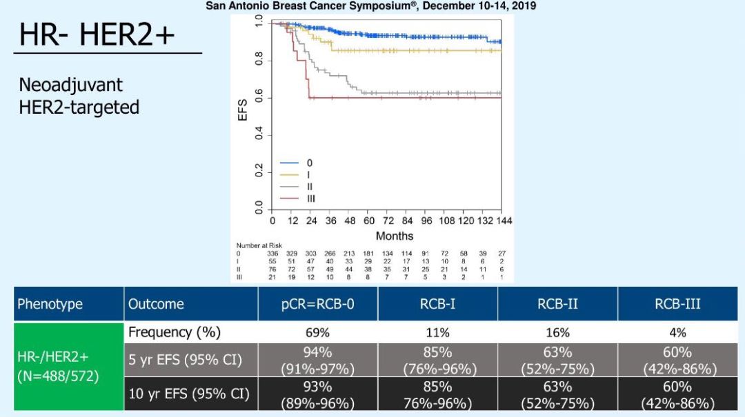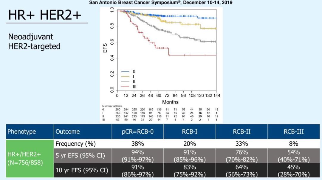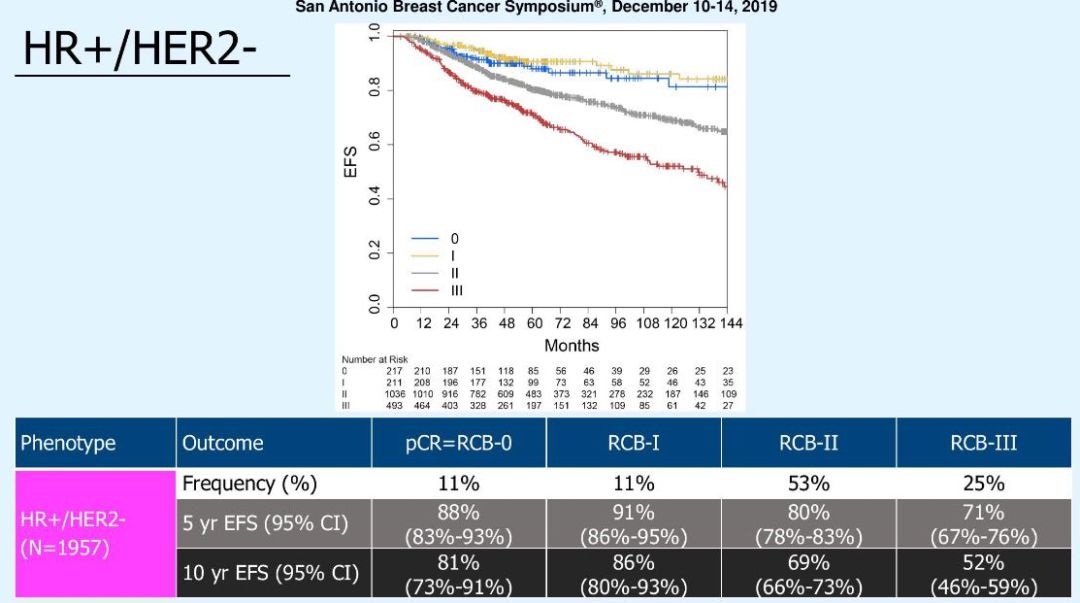 RCB为0级的,也就是乳腺或淋巴结无癌残留的患者显示出非常好的EFS,可达85%,而RCB 3级,即化疗耐受,广泛残留病变的患者EFS低于40%。COX比例风险回归模型显示RCB分级越高预后越差。该回顾性研究还给出了不同分子分型与RCB 的关系:TNBC中RCB为0级5年EFS为91%,RCB 3级仅为28%;HER2型患者中RCB为0级的5年EFS为94%,RCB 3级为60%;激素受体阳性、HER2阳性的三阳性乳腺癌患者RCB 0级5年EFS为94%,RCB 3级为54%;luminal型患者RCB 0级5年EFS为88%,RCB 3级为71%。可以看出RCB预测模型在不同分子亚型患者当中都是比较好的预测因子,尤其是TNBC及HER2型患者当中,RCB模型的应用会对后续治疗有很大的指导意义。