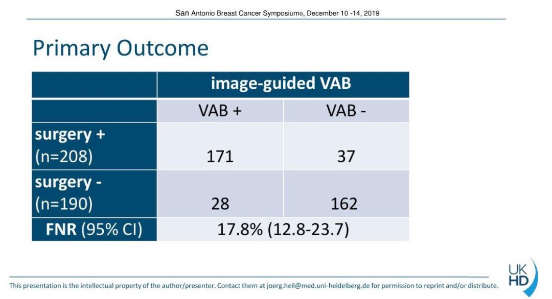 张东伟教授:随着系统治疗效果的极大提升,有学者提出设想,对于新辅助治疗达到pCR的患者或许可以进一步豁免手术,前提是需要得到一种精确的pCR评估方法。目前除了手术以外,尚无其他检查手段能够准确的评估pCR。这项来自德国海德堡的研究(摘要号:GS5-03)目的是想通过影像学引导下活检来判断是否达到完全缓解。患者通过新辅助治疗后影像学检查提示达到CR或PR的患者,应用真空辅助微创活检(VAB)进行评估,所有患者都进行手术治疗并对病灶行术后病理的检测。研究共入组398例患者,主要研究终点是检测残余肿瘤病灶的假阴性率(false negative rate,FNR)。