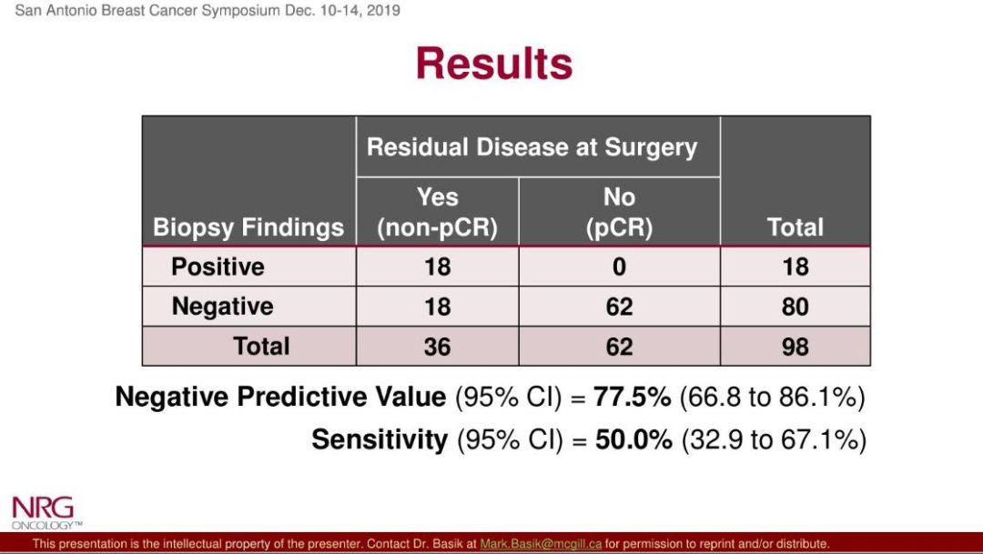 郭宝良教授:这项研究FNR虽然很低,但确实有样本量较小的因素。同时本次会还有二项报道的相关议题,一项Ⅱ期临床研究(NRG BR 005)也没有达到理想的阴性预测值,另外一项来自荷兰的MICRA研究同样是应用MRI、钼靶或超声引导的空芯针活检对残留病灶进行评估,FNR为37%,也没有取得理想的结果。这个研究中值得借鉴的是,通过MRI看到残存病灶的32例患者中,有28%的患者在术后证实其实是达到pCR的。这说明影像学的阳性预测结果也并不一定非常准确,最终还是需要通过病理学检测来判断。