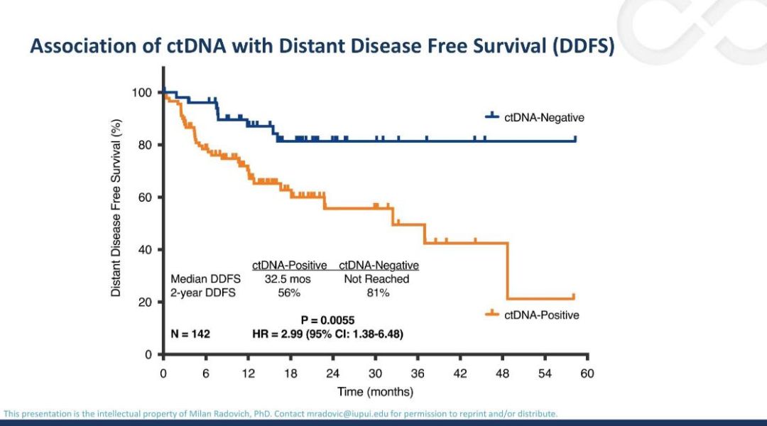 张建国教授:此次会议还报道了来自美国印地安纳大学的一项BRE12-158研究(摘要号:GS5-02),在TNBC新辅助治疗后利用ctDNA和CTC评估是否有微小残存病灶以及患者预后判断(无远处疾病生存,DDFS)。研究入组148例早期TNBC,在中位随访16.7个月时,ctDNA阳性患者与较差DDFS显著相关(中位DDFS为32.5个月,P=0.0055);随访3年时,ctDNA阳性患者的2年DDFS率仅为56%,而阴性患者高达81%。初步得出结论认为ctDNA阳性患者可能存在微小病灶而预后较差,需要进一步的监测随访和加强治疗。另外ctDNA和CTC联合能够更好的进行疗效评估