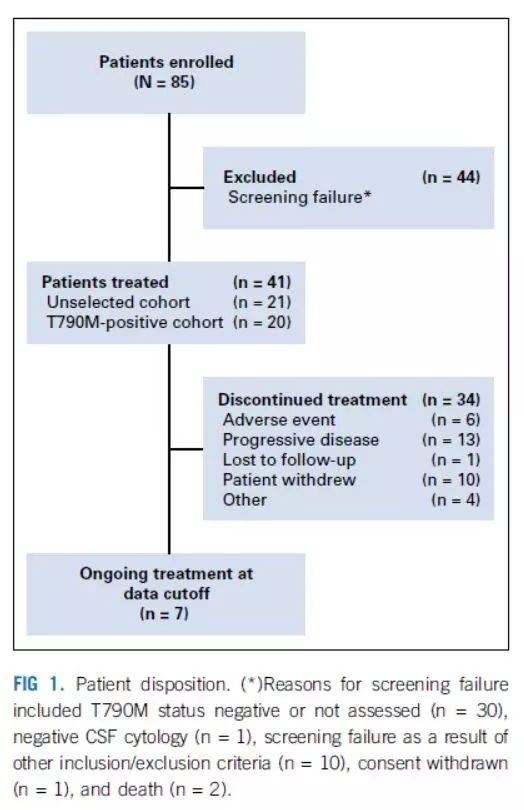 BLOOM研究是一项2部分、I期、开放标签的多中心临床研究。A部分包括AZD3759的剂量爬坡及扩展,数据已经报道;B部分报道160mg(无剂量爬坡过程)奥希替尼治疗EGFR突变且存在脑膜转移患者的疗效、神经症状改善及安全性。B部分又分为两个队列:未选择人群及T790M突变人群。主要入组标准包括:超过18周岁病理学确诊的晚期NSCLC,且携带19del或21L858R,脑脊液(CSF)细胞学检测确定存在脑膜转移,其中至少有一个脑膜病灶可以进行疗效评估(基于MRI),既往接受EGFR-TKI治疗后进展,PS评分0-2分。仅仅通过影像学确认的脑膜转移患者不能入组。符合入组标准的患者接受奥希替尼160mg治疗直至疾病进展、发生不可耐受不良反应或患者撤销知情同意。每6周进行一次疗效评估。非CNS病灶及可测量CNS病灶基于RECIST标准衡量,脑膜转移病灶同时采用RANO-LM协作组标准进行评估。同时患者基线及每21天进行一次神经功能检测。