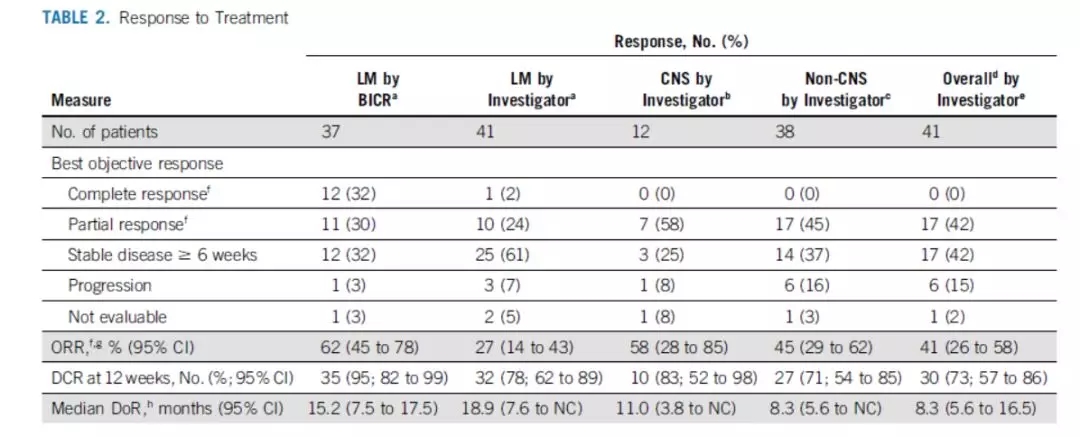 这项研究有几点需要注意:①研究者评估的LM ORR(27%)和独立评审委员会评估的LM ORR(62%)存在较大差距,作者在讨论中解释道这可能是由于不同评估专家基于影像学手段进行疗效评估时的主观因素导致的;