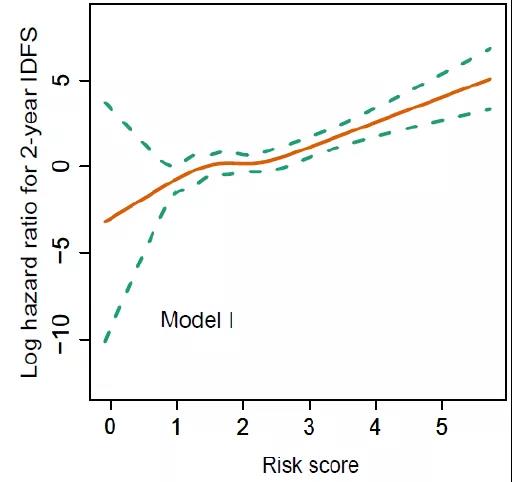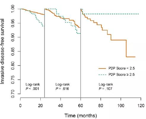 当该模型作为分类变量时,以2.5分为界将患者分为高危组(>2.5)及低位组(≤2.5)。生存分析显示该模型对0-2年的IDFS具有较好的预测能力(Log-rank P=.001)。校正了临床病理指标以后,多因素分析同样提示该模型(分类型)对0-2年的IDFS具有较好的预测能力(HR, 2.89; 95% CI, 1.28-6.52; P=010)。