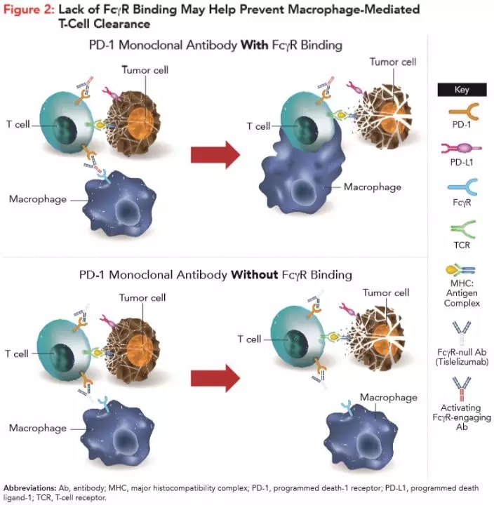 BGB-A317-310是一项随机、双盲、安慰剂对照的III期研究,在中国25~36个研究中心进行,研究将比较替雷利珠单抗联合顺铂或卡铂+吉西他滨与安慰剂联合顺铂或卡铂+吉西他滨作为局部晚期或转移性UC患者一线治疗的疗效和安全性/耐受性。替雷利珠单抗是一个创新的对PD-1具有高亲和力和特异性的单克隆抗体,与PD-1有独特的结合表位(图1),可最大限度地减少与巨噬细胞上FcγR 的结合,从而消除抗体依赖的细胞吞噬作用,这是减少T细胞耗竭和抗PD-1治疗耐药的潜在机制(图2)。