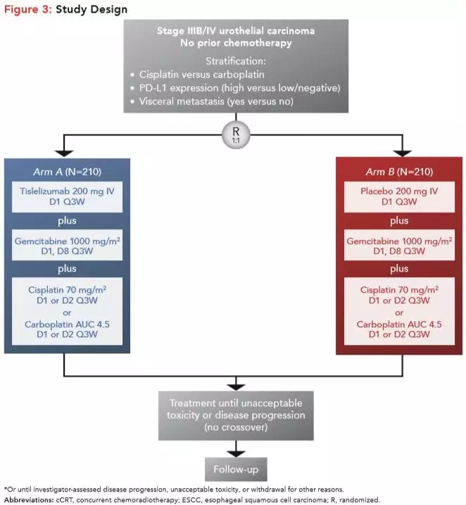 这项研究纳入年龄18-75岁、经组织学确诊患有无法手术的局部晚期或转移性尿路上皮癌;患者适合接受顺铂或卡铂药物治疗,既往未接受过系统化疗和PD-1,PD-L1,PD-L2、CTLA4为靶点的治疗或其他专门以 T 细胞协同刺激或检查点通道为靶点的抗体或药物治疗。420例患者1:1随机分入化疗+替雷利珠单抗组(A组)或化疗+安慰剂组(B组)。