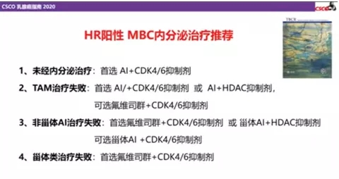 我们从以上推荐中可以看出,内分泌+靶向的联合应用受到重视。其中,未经内分泌治疗的患者首选AI+CDK4/6抑制剂;TAM治疗失败的人群首选AI+CDK4/6抑制剂或AI+HDAC抑制剂,由于医保因素,氟维司群+CDK4/6抑制剂仅为可选方案;非甾体AI治疗失败首选氟维司群+ CDK4/6抑制剂或甾体AI+HDAC抑制剂,可选甾体AI+ CDK4/6抑制剂;甾体AI治疗失败首选氟维司群+ CDK4/6抑制剂。