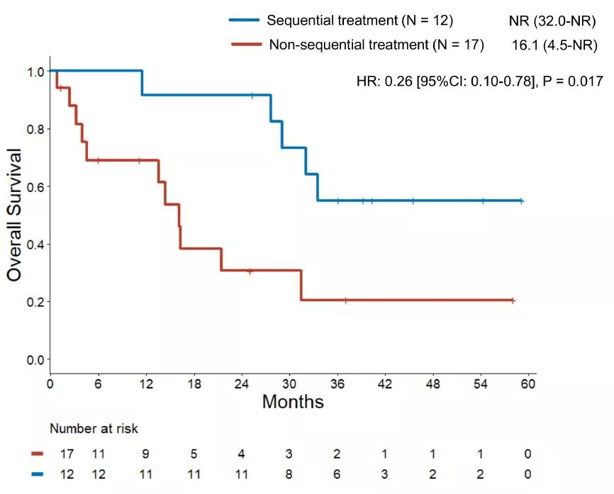 研究共纳入29例至少接受一种ROS1-TKI治疗的患者,中位年龄51岁,70.8%的患者为女性,68.9%的患者不吸烟。一代TKI进展后,11例患者接受了其他TKI的治疗,中位PFS2为5.5个月,进展后的中位OS为21.0个月。其中,接受劳拉替尼治疗的患者,ORR、中位PFS和中位OS分别为41.7%、12.7个月和17.0个月。一代TKI进展后,续贯其他TKI治疗的患者拥有更长的OS,且死亡风险可降低74%。