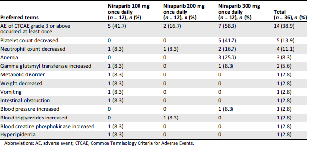 表3. 尼拉帕尼治疗相关的≥3级的不良事件
