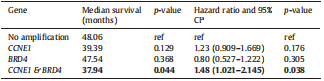 图1. CCNE1、BRD4基因扩增时中位生存期及差异表现