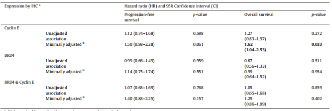在来源于VUMC TROC TMA的110例HGSOC患者中,32例(29%)患者cyclin E和BRD4蛋白同时高表达,但是它们同时高表达并不与不良预后有关(HR=1.29),这可能与样本数少有关。Cyclin E的高表达与不良预后有关(HR=1.62),BRD4的表达与预后无关(HR=0.99)。