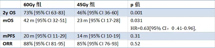 2014-2018年,22家医院共176例患者入组,其中160例(60Gy:84例;45Gy:76例)患者完成方案规定的治疗纳入本次分析。中位年龄65岁,女性占58%,90%患者PS评分为0-1分。高剂量照射显著提高患者2年生存率和中位生存时间。两组客观缓解率和无疾病进展无显著差异。高剂量照射未显著增加3-4级食管炎和肺炎。低剂量组有更多的粒缺感染倾向。其他3-4级毒性2组无显著差异。共3例患者出现治疗期间死亡,其中60Gy组2例(粒缺感染、主动脉夹层),45Gy组1例(血小板减少性出血)。