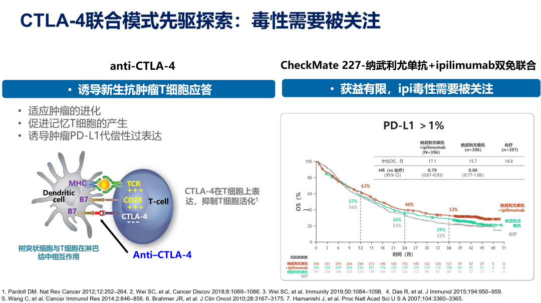 张绪超教授:一方面, PD-1与PD-L1作用机制不同。PD-1抑制剂可以阻断PD-1与PD-L1和PD-L2结合,于是额外带来PD-L2与RGMB结合,从而活化T细胞;而PD-L1在阻断PD-1与PD-L1结合的同时,也会阻断抗原呈递细胞表面PD-L1与CD80的结合,引发CD80与CTLA4结合,从而抑制T细胞。貌似PD-1抑制剂的作用更强,但更多研究显示PD-L1更加成功,从机制上并不能完全得到合理的解释。另一方面,免疫治疗的临床研究设计并不完善:第一,免疫抑制剂的剂量远超其占据所有受体所需剂量,不必要的大剂量可能带来了疾病进展;第二,免疫治疗的药物使用时间并无统一标准;第三,临床终点的设计不合理,虽然KEYNOTE604研究报出阴性结果,但其2年OS率非常可观,所以免疫治疗的临床设计是否需要优化仍未可知。