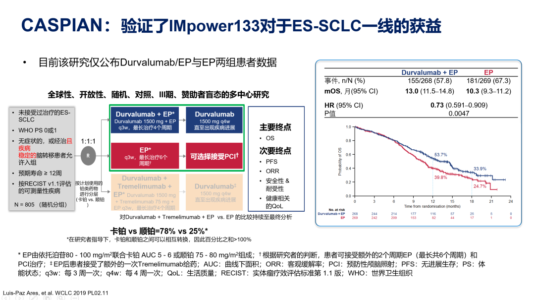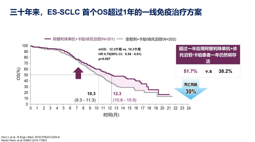 NSCLC免疫治疗新的靶点不断发展,一路乘风,披荆斩棘。而SCLC则刚刚打开局面,破浪前行。近30年来,SCLC的一线治疗进展缓慢,超过40项大型研究、60个药物的探索不幸铩羽。免疫治疗时代,Checkmate 032 与KEYNOTE 028研究在SCLC三线及以上探索免疫治疗取得初步进展,但Checkmate 451研究中纳武单抗和KEYNOTE 604研究中帕博利珠单抗在SCLC的一线探索双双失利。所幸,IMpower 133中阿替利珠单抗打破藩篱,在ES-SCLC患者的一线治疗中联合化疗较化疗降低30%的死亡风险,一举成为30年来改变指南的免疫治疗破局者。研究的脚步不止于此,CASPIAN研究中德瓦鲁单抗联合化疗一线治疗ES-SCLC降低27%死亡风险,再次证实了IMpower133的结果。未来,更多免疫治疗联合模式不断探索,放疗联合免疫的研究正在进行,肺癌免疫治疗不再是“多歧路”,我们正乘风破浪,直挂云帆济沧海。