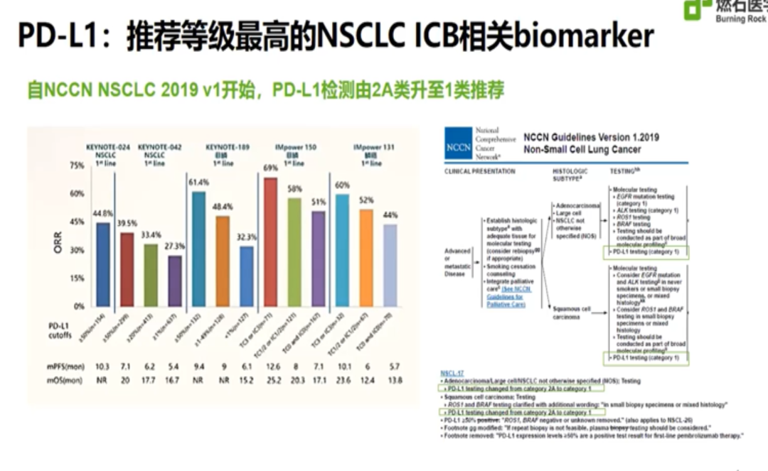 在Checkmate 026研究失败之际,对患者进行基于TMB的区分后发现了TMB-H患者获益更佳。随后,Checkmate 568研究确定了TMB界值为≥10mut/Mb。于是研究者修改了Checkmate 227的研究设计,对NSCLC双免疫治疗新增了主要研究终点,即基于TMB选择人群的PFS表现,并以10mut/Mb为界值。最终结果显示TMB-H人群,无论PD-L1状态如何,双免疫疗效较化疗能显著延长患者PFS。因此,TMB作为NSCLC良好的预测因子于2019年被首次写入NCCN指南。