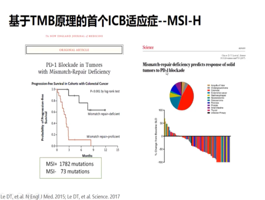目前国内外证据级别最高的免疫治疗肿瘤标志物是PD-L1,2019年 NCCN NSCLC指南已将PD-L1检测作为1类推荐。但PD-L1远不能满足当前需求,基于基因组信息的标志物探索进入了研究者的视野,TMB以简单数值反映肿瘤基因组变化全貌的指标成为了理想的肿瘤标志物。早在2015年,KEYNOTE-001研究就显示了NSCLC中TMB高表达患者免疫治疗的获益更多。究其原因,可能是TMB-H患者伴有更多的DNA损伤修复通路的突变。于是研究者迅速开启了基于TMB原理的免疫治疗人群选择研究,在不同的肿瘤中,微卫星不稳定高(MSI-H)的患者往往意味着更高的TMB,从而进一步证实了MSI-H患者可以从免疫治疗中取得更佳的生存获益。因此,MSI成为首个FDA批准的不区分阻止来源的免疫治疗生物标志物。
