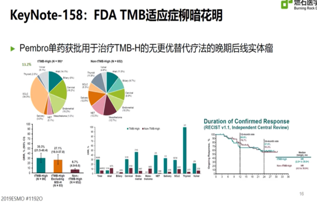 但最终在Checkmate227研究亚组中,无论TMB高低,NSCLC一线双免疫治疗的OS均优于化疗,无法证实TMB-H人群双免疫治疗较TMB-L的优势,以TMB-H为基础申请FDA适应症的期望无奈折戟沉沙。不久之后,KEYNOTE158研究带来了新的希望,该研究以也10mut/Mb为界值,取得了十分优秀的ORR表现,因此帕博利珠单抗被FDA批准后线用于TMB-H的肿瘤患者。