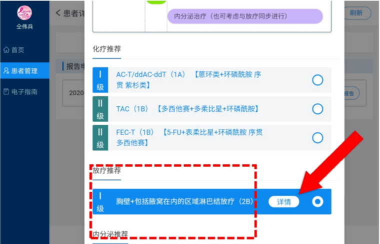 “CSCO AI FOR BC”智能决策系统的界面非常扁平化、简洁明了。当输入该患者信息后,系统立即给出了一系列规范化诊疗建议:推荐治疗方式,治疗路径顺序、治疗方案、推荐等级等。一目了然,十分清晰。患者可以很好的了解本阶段所需要接受的相关治疗,同时也可以通过治疗路径,清晰了解自身所处的治疗阶段及后续需要接受的相关治疗,从而增加患者的治疗依从性。