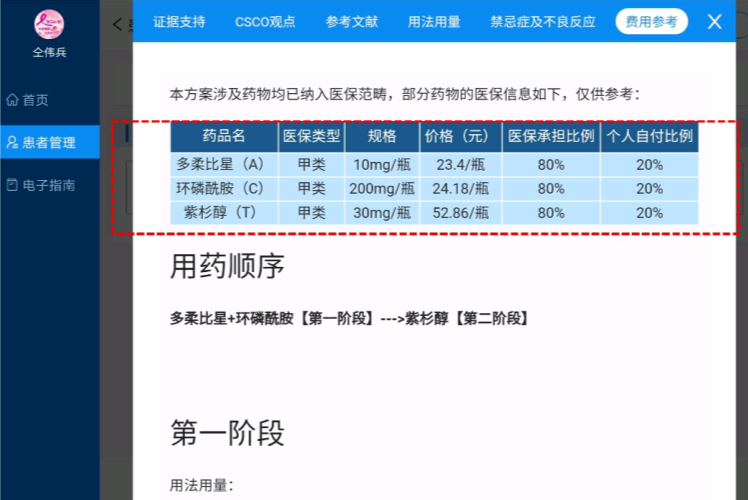 在2020年CSCO AI进行了重要更新,增加了费用参考,比如在笔者选择辅助内分泌治疗时,该系统可以迅速告知患者每个周期所需的费用,自付比例,以及完成治疗所需自费的费用,帮助患者根据自身条件选择最佳的治疗方案,提高治疗的延续性。