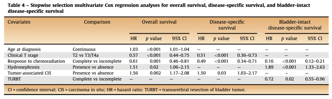 ▲影响膀胱癌患者OS和特异性生存的多因素分析