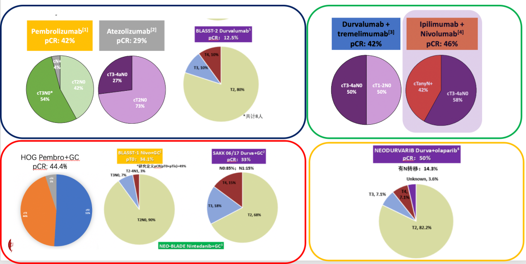 随着免疫治疗的兴起,出现了一系列新辅助免疫治疗(包括免疫单药、免疫联合化疗、联合免疫、免疫联合PARP抑制剂)的Ⅱ期临床研究,这些研究初期报告的pCR从12.5%~50%,与传统的新辅助化疗的pCR数据相似,给临床上带来新辅助免疫治疗的热潮。但需要指出的是,这些小规模的单臂Ⅱ期研究,主要关注pCR的情况,能否转化为生存获益需要进一步研究才能确认,因此仍应建议在临床试验的背景下采用。