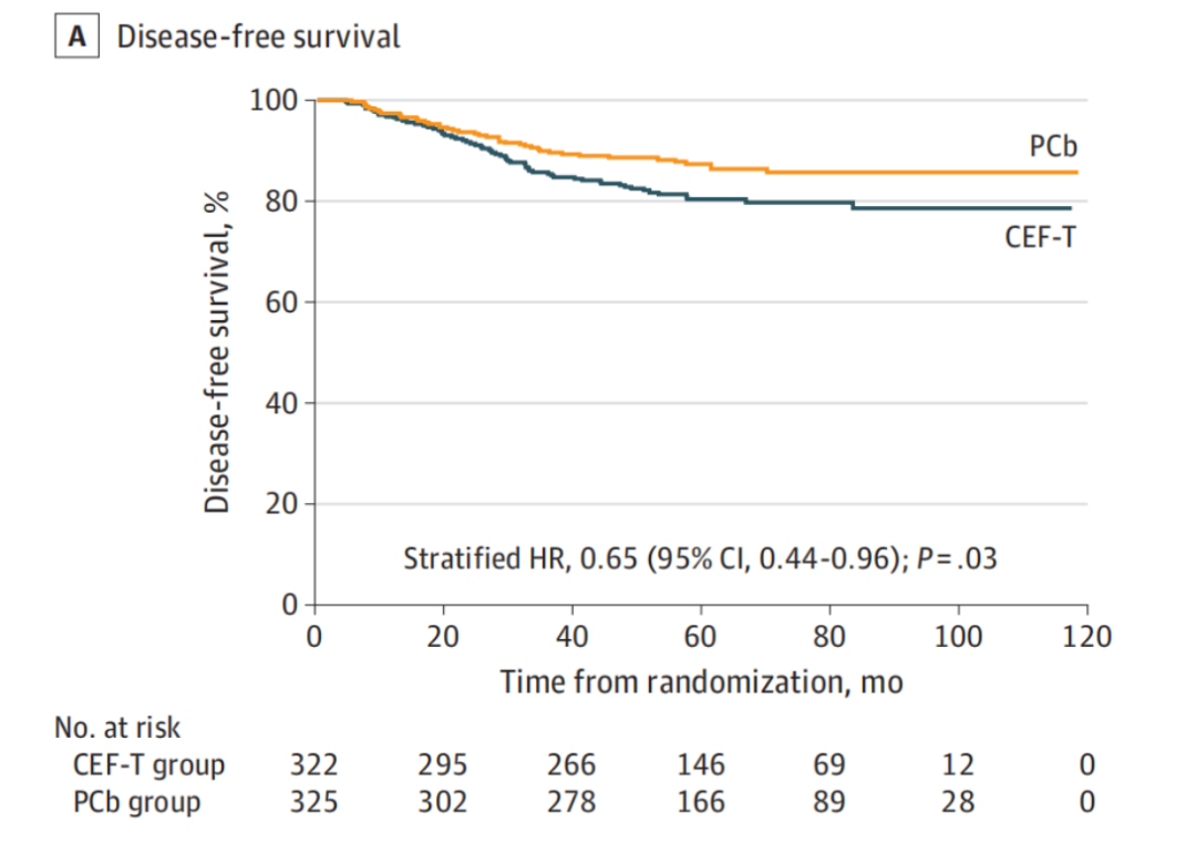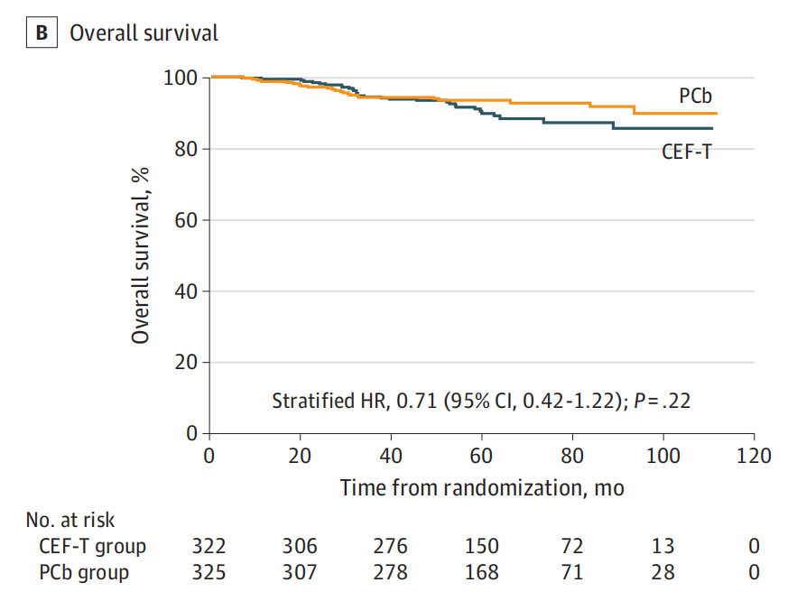 经过八年多的研究和随访,PATTERN研究结果公布,并于今年8月份正式发表于JAMA Oncology。PATTERN研究结果证明,在特定的三阴性乳腺癌患者中,加用铂类治疗可提高患者的有效率并减少复发风险。中位随访62个月,与CEF-T方案相比,PCb组5年的DFS率提高了6.2%(86.5% vs 80.3%,HR=0.65,95%CI:0.44~0.96,P=0.03)(见图2),确认了铂类在早期TNBC辅助治疗中的地位。但两组间的OS无显著差异,期待长期随访结果。同时,该研究还证明,在有gBRCA 1/2突变或者是有同源重组修复障碍的患者中,治疗效果更为显著。PATTERN研究验证了含铂化疗(PCb)方案的可行性,但要想改变临床实践,还需进行更多探索和更长时间随访。