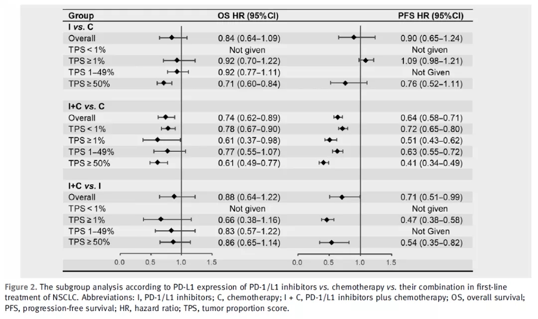 去年,何建行/梁文华教授团队在International Journal of Cancer发表了一项直接及间接荟萃分析,统计了11个PD-1(L1)抑制剂用于NSCLC晚期一线的随机对照研究,共6,731名患者。联合治疗的PFS(HR 0.64)与OS(HR 0.74)均优于化疗,联合治疗组的PFS也优于PD-1/L1单药治疗(HR 0.71)。尤其在PD-L1≥50%人群中,通过间接对比分析,在PD-L1≥50%人群中联合治疗在PFS(HR=0.54)方面显著优于PD-1 / L1单药。