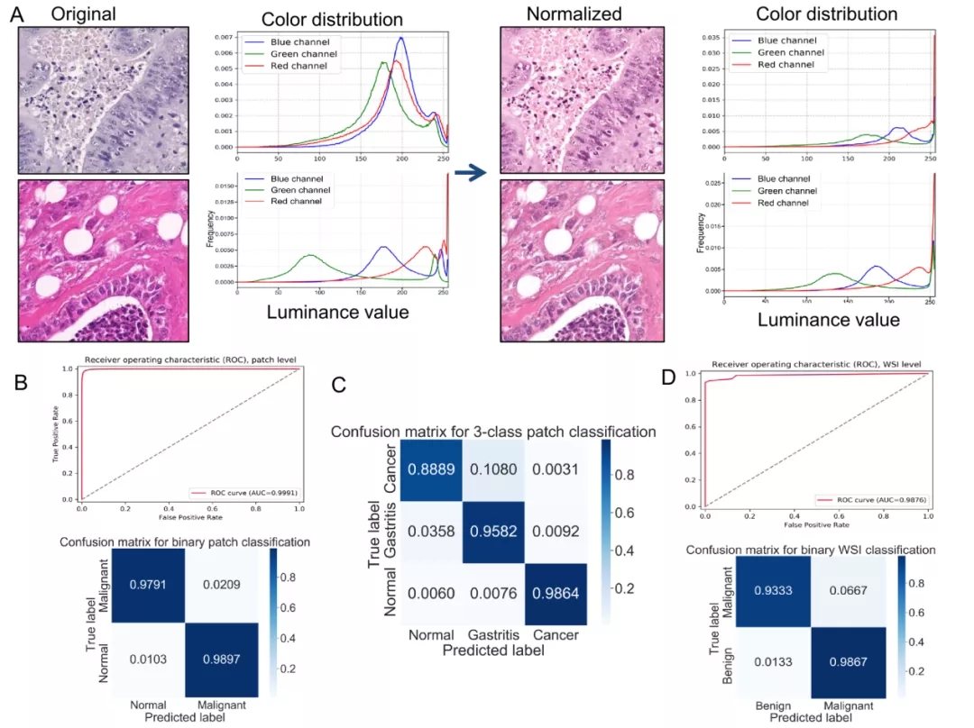 该研究入组了763 张胃黏膜病理切片,全部先经过KF-pro-400 全自动切片扫描仪进行数字病理图像的转化(whole-slide images,WSI),然后由资深病理医师利用ASAP软件分别将切片中的正常胃黏膜、慢性胃炎和肠型胃癌区域标注出来。其中 338 张是正常胃黏膜,118张是慢性胃炎,307张是肠型胃癌。AI团队的分析人员利用上述标注好的WSI进行组织图像染色的归一化处理,使得WSI图片的染色差异明显降低,不仅仅节省了重新制备玻片的经济成本和时间成本,同时实现了优化AI分析模型的效果(图1)。由于病理学数字化图像过大(每张平均数据量约2-3Gb)无法直接放入计算机分析,均需要先将图像切割成子图集(patches)再进行后续的AI模型训练。利用子图集训练计算机也是借鉴了病理学家常规阅片时从低倍-中倍-高倍的逐级放大过程。本研究分别采用了像素(pixels)为 768×768、1024×1024、1495×1495 和2048×2048的子图集去训练计算机模型,不仅识别出不同尺度的组织结构轮廓特征,还识别到精细的细胞纹理特征。AI介入医学影像分析研究中,理想状态是纳入训练的图像越多越好,但现实情况下往往是能够采集到的图像有限。因此,AI研究人员还通过30度旋转、镜像、20%维度移动或者切割、垂直翻转或者水平翻转等技术手段进行图像扩增。
