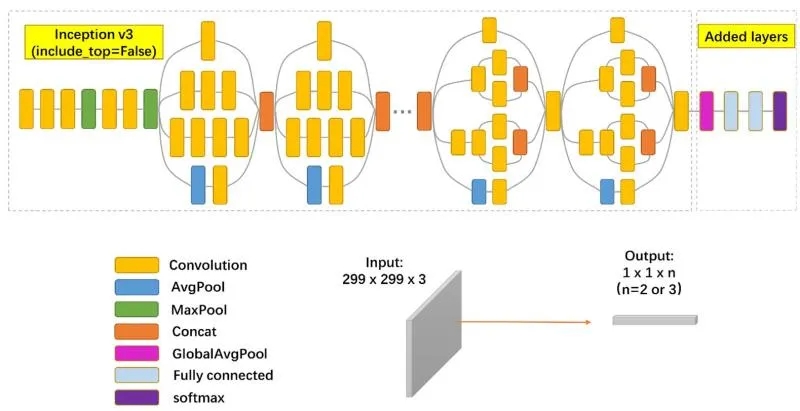 医学影像分析中最常用的计算机模型称之为卷积神经网络(convolutional neural networks,CNN)模型。经过近几年的发展,开源数据平台中已有数个较为成熟的模型可供选择,但若将现存的模型均测试一遍则既费时间又会给计算机硬件增加负担。针对这一问题,课题组采取的措施是先用少量子图集对各种模型进行初步测试,比如VGG16、Resnet50、Densenet169、InceptionResnet v2和Inception v3。经预实验发现Inception v3表现良好,遂选择该CNN模型用于后续研究。该模型既往在皮肤癌分类、糖尿病视网膜病变分类研究中均表现良好,Inception v3为谷歌公司开发的CNN模型,也比较适合病理学图像分析。本研究以Inception v3为基础,增加了一个全局平均池化层(global average pooling layer)、两个全连接层(fully connected layers) 和一个软最大层(soft-max layer),经过改良的 Inception v3模型最终达到43层(图2)。分析模型确立后便在子图级别(图块)进行病变图像的预测。研究显示,该模型对两分类目标病变(正常-胃癌两分类)的识别准确率达到98.4%,在三分类病变(正常-慢性炎症-胃癌三分类)的识别准确率达到94.5%。在进一步的WSI整图级分类任务中,对正常胃黏膜组织和肠型胃癌组织的识别准确率达到96.0%。