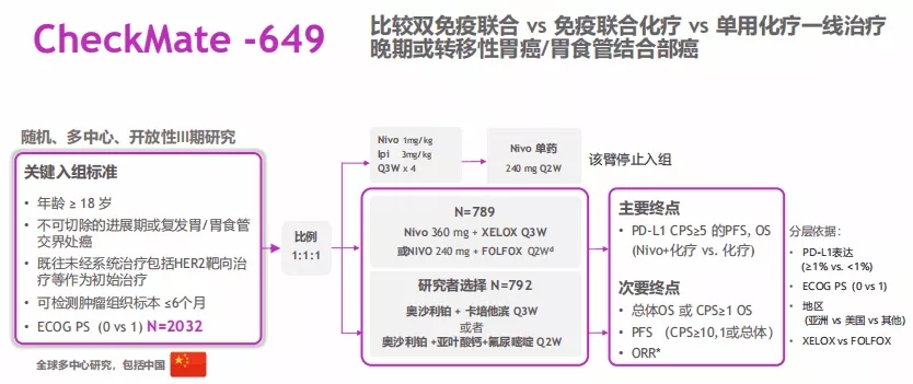 CheckMate-649研究旨在探索纳武利尤单抗联合化疗、双免疫联合及单纯化疗一线治疗HER2阴性、晚期或转移性胃癌、胃食管连接部癌或食管腺癌(GC/GEJC/EAC)患者的疗效。整体研究纳入全球多个国家及地区的2032例患者,其中,中国患者占比达13.4%。