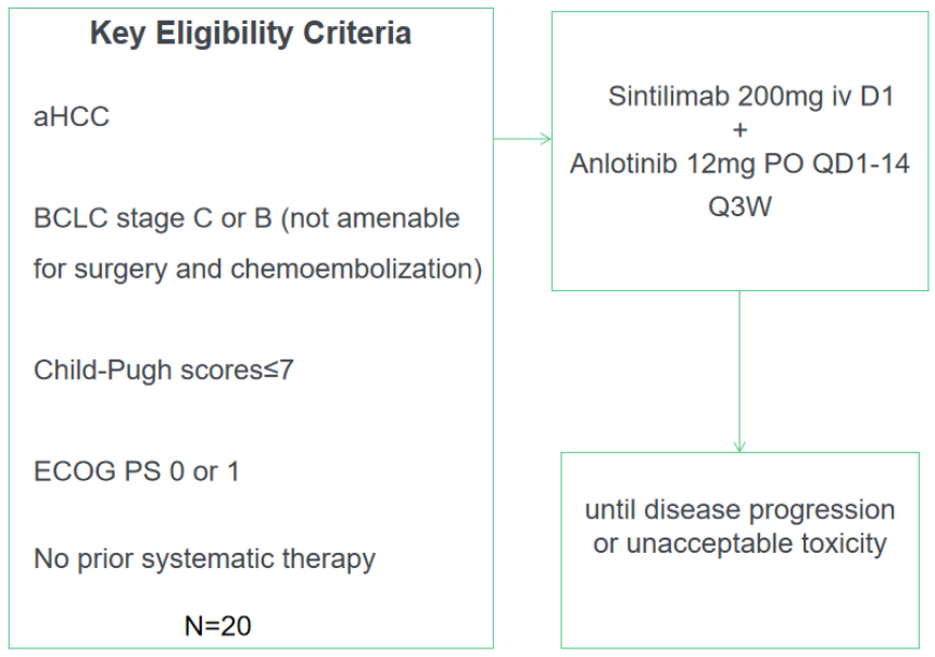 方法:这是一项单臂2期试验。入组人群为BCLC分期C或B(不适合手术和化疗栓塞术)、Child-Pugh评分≤7、ECOG PS≤1的aHCC患者,给予每3周一次的信迪利单抗(200mg,iv,D1)联合安罗替尼(12mg,po,QD,D1-14)一线治疗,直到病情恶化或出现不可耐受的毒性。主要终点为安全性和客观有效率(ORR, RECIST 1.1),次要终点包括疾病控制率(DCR)、无进展生存(PFS)、缓解持续时间(DoR)和总生存(OS)。