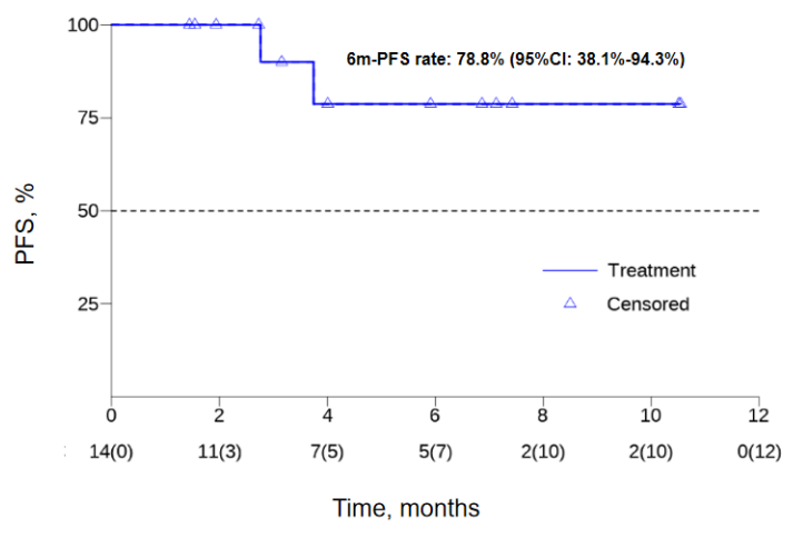 14例可评估的患者中,ORR为42.9%(6/14),1例CR,5例PR,7例SD,DCR为92.9%(13/14)。中位DoR未到达(95%CI:9.0个月 vs NR),数据截止时所有的肿瘤缓解仍在持续中。6个月PFS率为78.8%(95%CI:38.1~94.3%),中位PFS未到达。