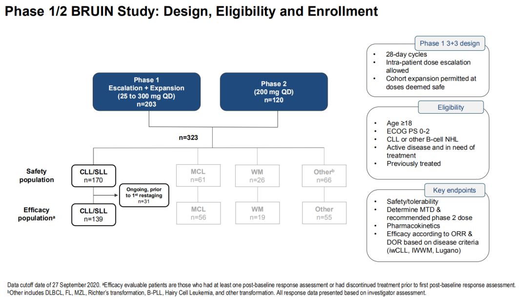 BRUIN试验即旨在确定LOXO-305(可抑制野生型(WT)和C481突变的新一代BTKi,且具有低nM效价。)在B细胞淋巴瘤患者中的安全性和早期疗效。
