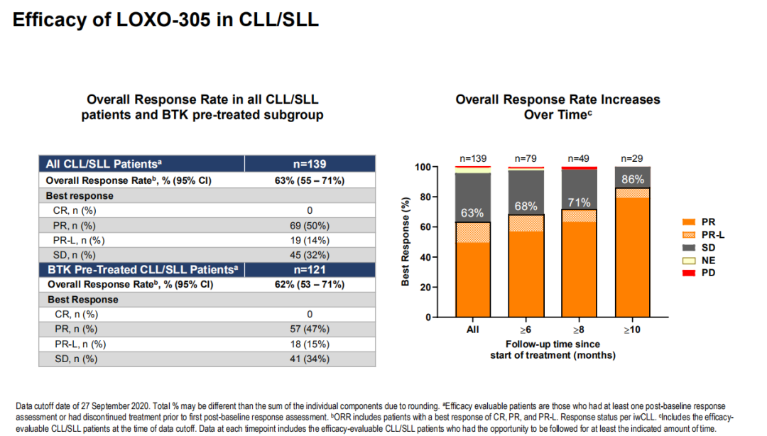 LOXO-305对于既往接受多轮治疗(包括共价BTK抑制剂和BCL2抑制剂)且预后较差的CLL/SLL患者表现出良好的疗效。并且LOXO-305的有效性并不局限于BTK C481突变患者。且LOXO-305耐受性良好,治疗窗较为宽泛。
