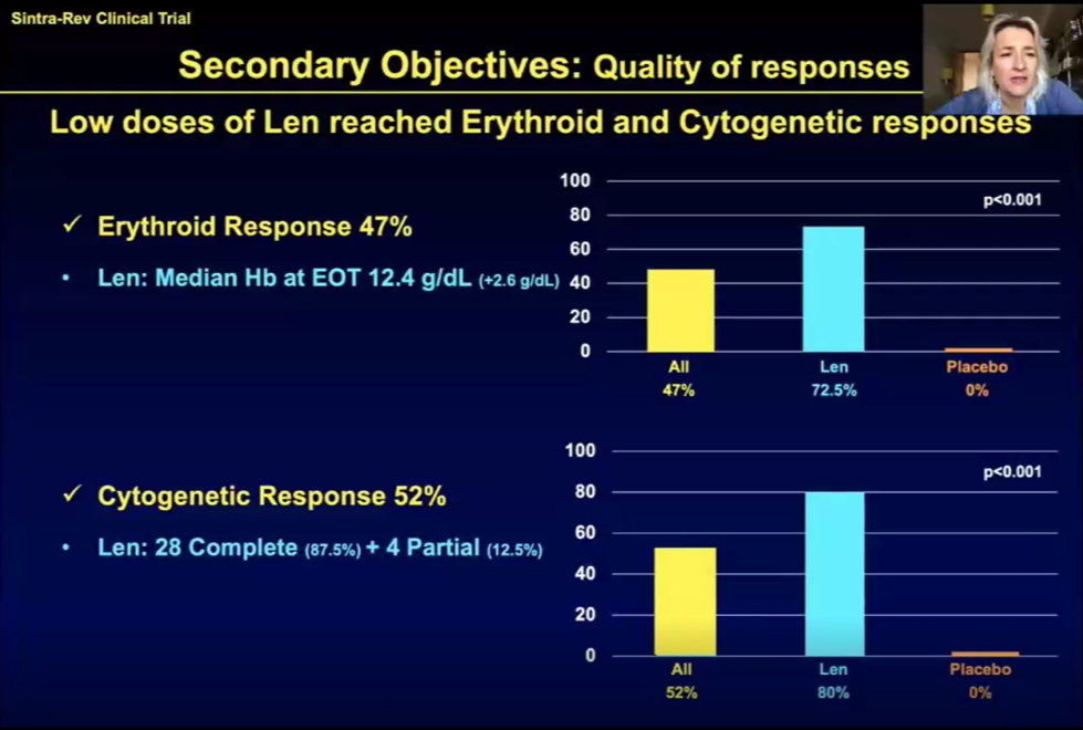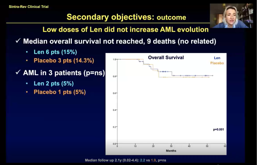 ①有效性方面:57例患者被纳入ITT疗效可评价人群,中位治疗时间为66周(范围3-121周),来那度胺组47%的患者成功完成了研究,而安慰剂组为33%。中位随访25.6个月后(Q1 16-Q3 39),未达到中位OS。来那度胺组患者至TD的中位时间为75.7个月,安慰剂组为25.9个月(HR 2.703,95CI 1.162-6.286,p=0.021),在72.5%的接受来那度胺治疗的患者中观察到HI-E应答,而安慰剂组为0%(p<0.001)。应答者的中位Hb改善为2.8 g/dL。80%的来那度胺患者获得了细胞遗传学缓解(CyR)。两组的OS相似(都未达到时间终点),但来那度胺组EFS更优(HR 2.274,95CI 1.034-5.001,p=0.041)。