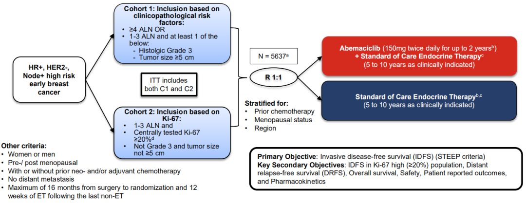 monarchE是一项随机、开放标签的多中心Ⅲ期临床研究,旨在比较abemaciclib+标准内分泌治疗和单纯标准内分泌治疗对于HR+/HER2-高危早期乳腺癌患者的疗效和安全性。该研究共从38个国家600多个中心纳入了5637例患者,按1:1比例分别随机abemaciclib+标准内分泌治疗或单纯标准内分泌治疗(ET)。入组患者病理腋窝淋巴结(ALN)阳性≥4个,或阳性腋窝淋巴结数为1至3个且至少具有以下一种高风险特征:原发性浸润性肿瘤≥5cm;肿瘤组织学分级3级;或中心实验室检测的Ki67指数≥20%。并根据既往是否接受化疗,患者绝经状态和地区进行分层。