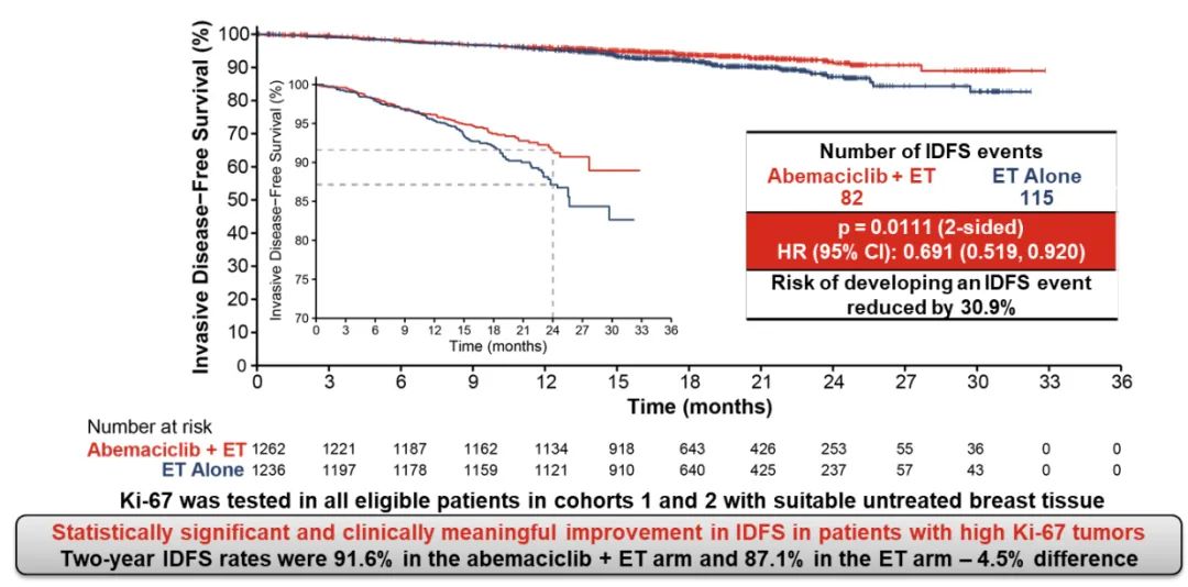 在高Ki67(≥20%)的肿瘤患者中,iDFS事件数量在abemaciclib+ET组为82,ET组为115(HR 0.691,95%Cl:0.519~0.920 P=0.0111),在abemaciclib的治疗下,iDFS事件风险降低30.9%,具有统计学意义和临床意义。abemaciclib+ET两年iDFS发生率为91.6%,ET组为87.1%,组间差异为4.5%。