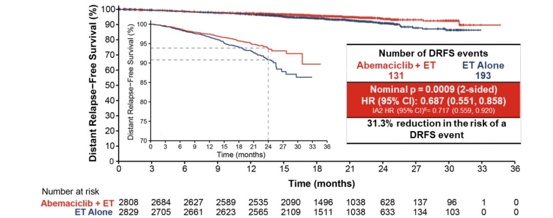 ITT人群中,abemaciclib+ET组DRFS事件数量为131,ET组为193(HR 0.687,95%Cl:0.551~0.858 P=0.0009),在abemaciclib的治疗下DRFS事件风险降低31.3%,abemaciclib+ET组两年DRFS发生率为93.8%,ET组为90.8%,组间差异为3.0%。DRFS风险的降低具有临床意义和治疗意义。